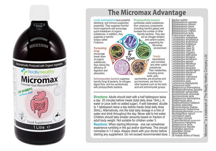 To further promote a healthy microbiome, The Really Healthy Company developed Micromax, a synergetic blend of microbes that can help repopulate the gut, discourage the growth of unhealthy bacteria, and increase the diversity of the microbial colonies. Two other food supplements important for immune function is Vitamin D3 and vitamin C.