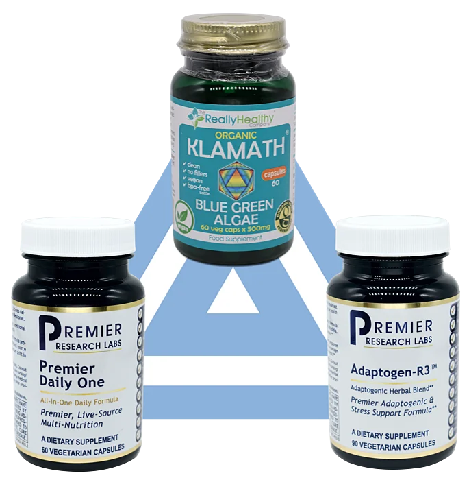 The first group recommendation is to help with stress. They provide herbal adaptogens that help us to recuperate, helping the body to become more resilient and vital. In addition, Premier Daily One – a live-source multi-nutrient for overall body support, as well as the wholefood nutritional powerhouse Klamath Blue Green Algae. Together, these supplements will help to rescue and support our systems during stressful times ahead.